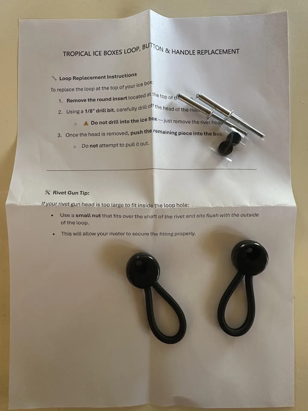 The required heavy-duty rivets are supplied with Tropical Ice Boxes spare parts (handles, loops and buttons).